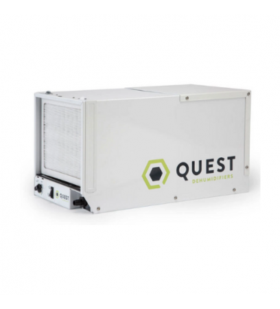 El deshumidificador Quest 70 es compacto y eficiente, ideal para espacios comerciales pequeños. Elimina 70 pintas de agua por día y tiene una eficiencia de 5 pintas/kWh. Funciona con un voltaje de 110-120V y consume 5.1 amperios. Ofrece un amplio rango de operación de temperatura y humedad, filtración MERV 13 y auto reinicio. Se puede instalar en el suelo o suspendido y no requiere instalación. Garantía de 5 años.